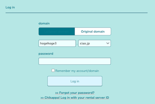 ② Select “Lolipop! Domain” and log in with the domain (e.g., hogehoge3.ciao.jp) and password you set up when you signed up.