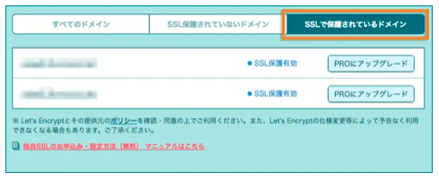 ⑤ Once the settings are complete, it will show “SSL protection enabled,” and you will be redirected to “Domains protected by SSL.”