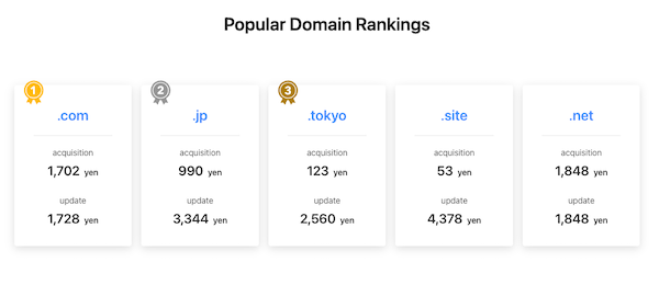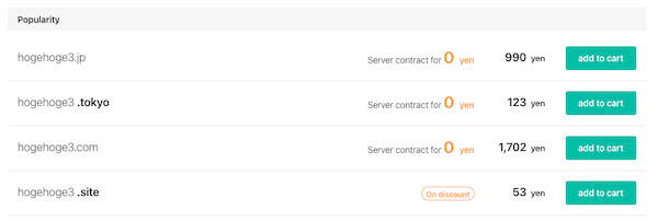 ④ Available domains will be displayed along with their prices, so add your desired domain to your cart. Check both the initial registration fee and the renewal fee before selecting. For example, “hogehoge3.com” costs 999 yen per year for initial registration and 1,728 yen per year for renewal.