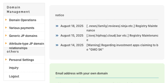⑧ Domain information verification may take 24 to 72 hours. If the target domain is listed under Domain Operations > Domain List and “No domains currently pending verification” is displayed in the list of unverified domains, the procedure is complete.