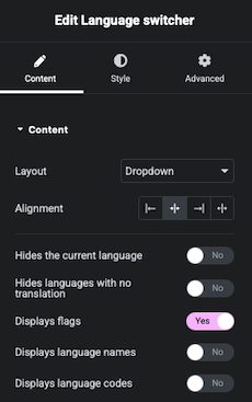 ⑧ Setting the “Language Switcher” as follows will display the language of the currently displayed site using only the national flag.