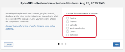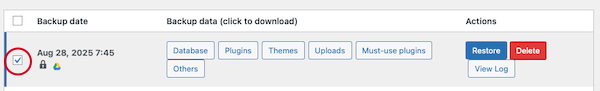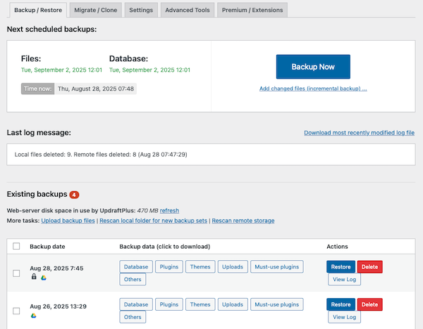 ⑥ Return to UpdraftPlus > Backup / Restore. Backups will be automatically created according to the schedule specified in “Settings.”