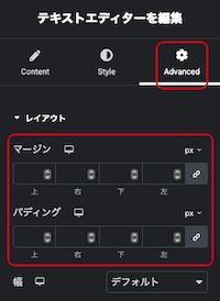 ⑳「テキストエディター」の内容のかたまりとしての配置については、以下で調整できます。
