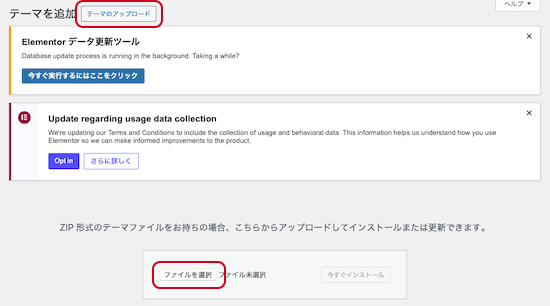 ⑩「テーマのアップロード」、「ファイルを選択」とクリックして、先ほどダウンロードしたZIPファイルをアップロードします。