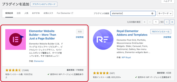 ③まずは「Elementor」を検索し、「今すぐインストール」します。