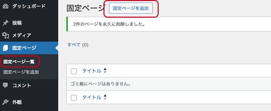 ①固定ページ>固定ページ一覧 を開き、「固定ページを追加」をクリックします。