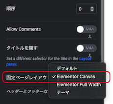 ⑤ 固定ページレイアウト:デフォルトを「Elementor Canvas」に変更します。