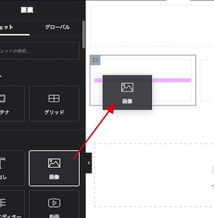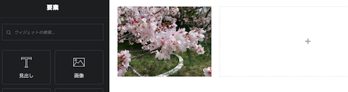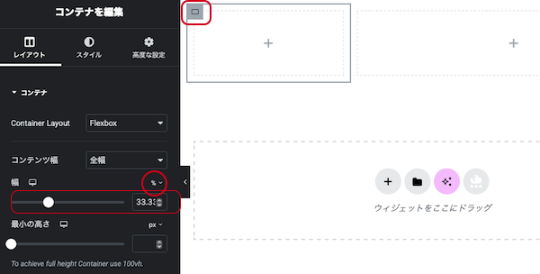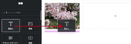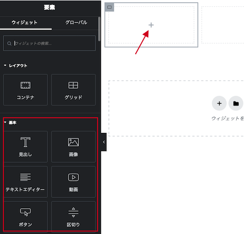 ⑨コンテナ内の「+」ボタンをクリックすると、ウィジェットが表示されます。ドラッグ&ドロップして追加します。