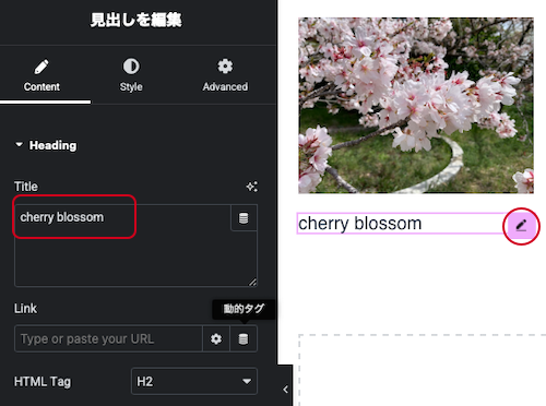 ⑮挿入した「見出し」を右の鉛筆マークをクリックして編集します。以下から調整できます。