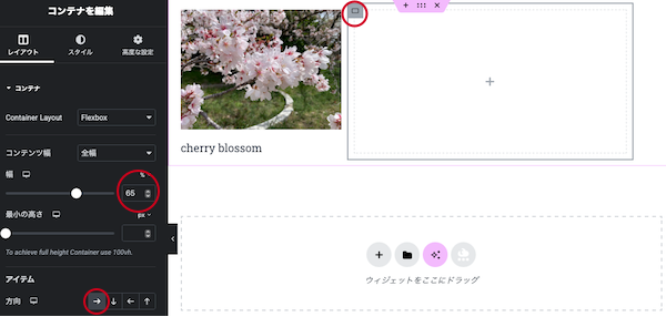 ⑯続いて右側のコンテナも編集していきます。右側のコンテナの左上の「コンテナの編集」をクリックします。幅は全体で100%になるよう、65%にします。