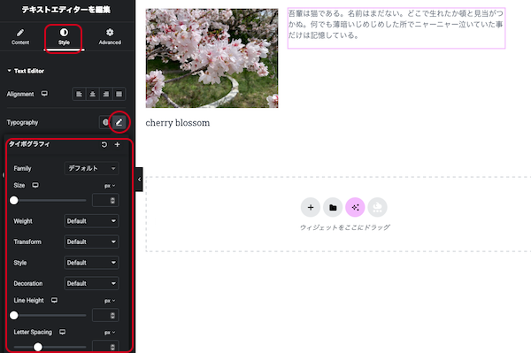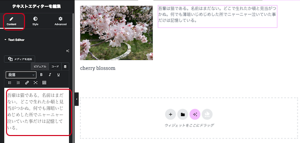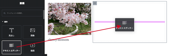 ⑰右側のコンテナの「+」をクリックします。追加できるウィジェットが表示されますので、テキストエディターをドラッグ&ドロップします。