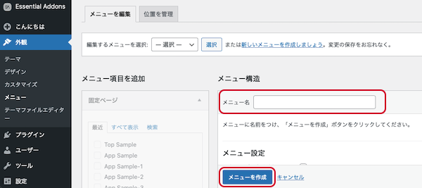 ②メニュー名を入れて「メニューを作成」します。「Menu_Sample」で作成してみます。