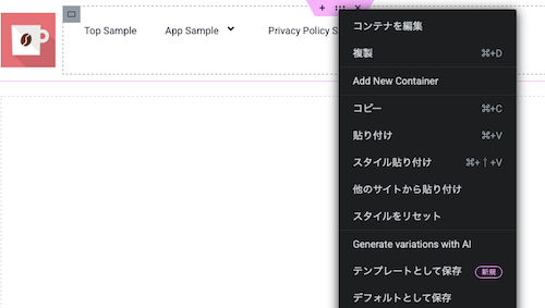 ⑩作成したメニューバーは、セクションの6点マークを右クリックして、コピーして他のページにペーストしたり、テンプレートとして保存して使い回しできます。このあと作成するフッターも同様です。