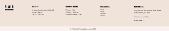 ②About us、Quick Link、Contact Info、Newsletter など、表示させたい情報を記載します。以下はElementorで利用できるサンプルテンプレートです。参考にしてみてください。