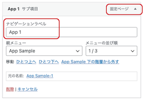⑤各メニューラベルは「固定ページ▲」をクリックして、実際の表示ラベルを調整できます。