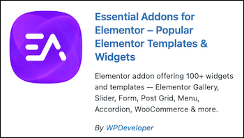 ①プラグインの「Essential Addons」をインストールします。WordPress の プラグイン > プラグインを追加 から検索して、インストール、有効化します。