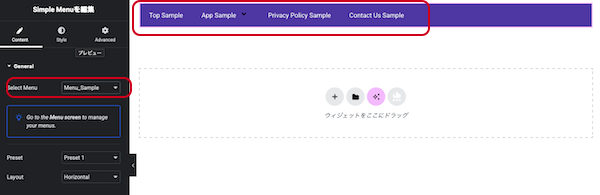 ④Content>Select Menu で作成済みの「Menu_Sample」を選択すれば、すぐにメニューラベルが反映されます。