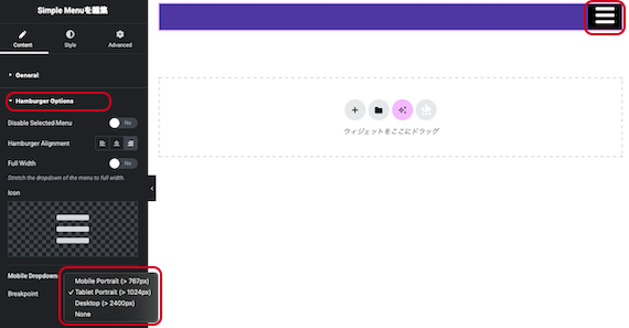 • コンテント > Hamberger Options > Breakpoint