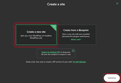 ⑤「Create a new site」を選択して「Continue」で進みます。