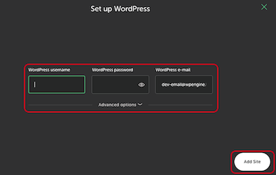 ⑧WordPressの以下ログイン情報を入れて「Add Site」でローカルサイトが作成されます。